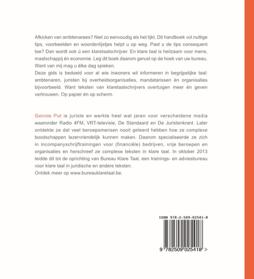 Afkicken van ambtenarees? Niet zo eenvoudig als het lijkt. Dit handboek vol nuttige tips, voorbeelden en woordenlijstjes helpt u op weg. Past u de tips consequent toe? Dan wordt ook ú een klaretaalschrijver. En klare taal is heilzaam voor mens, maatschappij én economie. Leg dit boek daarom gerust op de hoek van uw bureau. Want van mij mag u élke dag spieken.