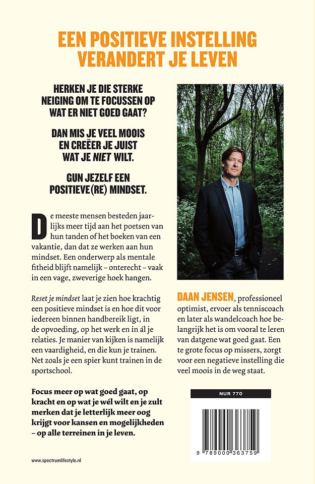 In 'Reset je mindset' laat Daan Jensen zien wat er gebeurt als je je juist gaat richten op het witte vlak. Het is dé strategie die de mentaal sterkste sporters volgen. Focussen op het positieve geeft een enorme boost aan je leven en aan dat van anderen om je heen. Het is Daans missie, door middel van dit boek, zijn blog en podcast en (persoonlijke) coaching, om zo veel mogelijk mensen te bereiken en hen te helpen.