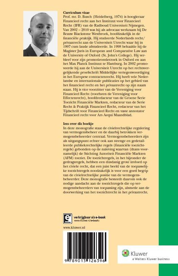 Vermogensbeheerders zijn als uitgangspunt echter ook aan strenge en gedetailleerde publiekrechtelijke regels (financiële toezichtregels) gebonden op de naleving waarvan (thans voornamelijk) de Stichting Autoriteit Financiële Markten (AFM) toeziet. De toezichtregels, in het bijzonder de gedragsregels, hebben een dusdanig grote invloed op het civiele recht, dat een juist beeld van de toepasselijke toezichtregels noodzakelijk is voor een goed begrip van de civielrechtelijke positie van de vermogensbeheerder. Deze monografie besteedt daarom ook de nodige aandacht aan de toezichtregels die op vermogensbeheerders van toepassing zijn, maar ook aan de doorwerking van het toezichtrecht in het privaatrecht.