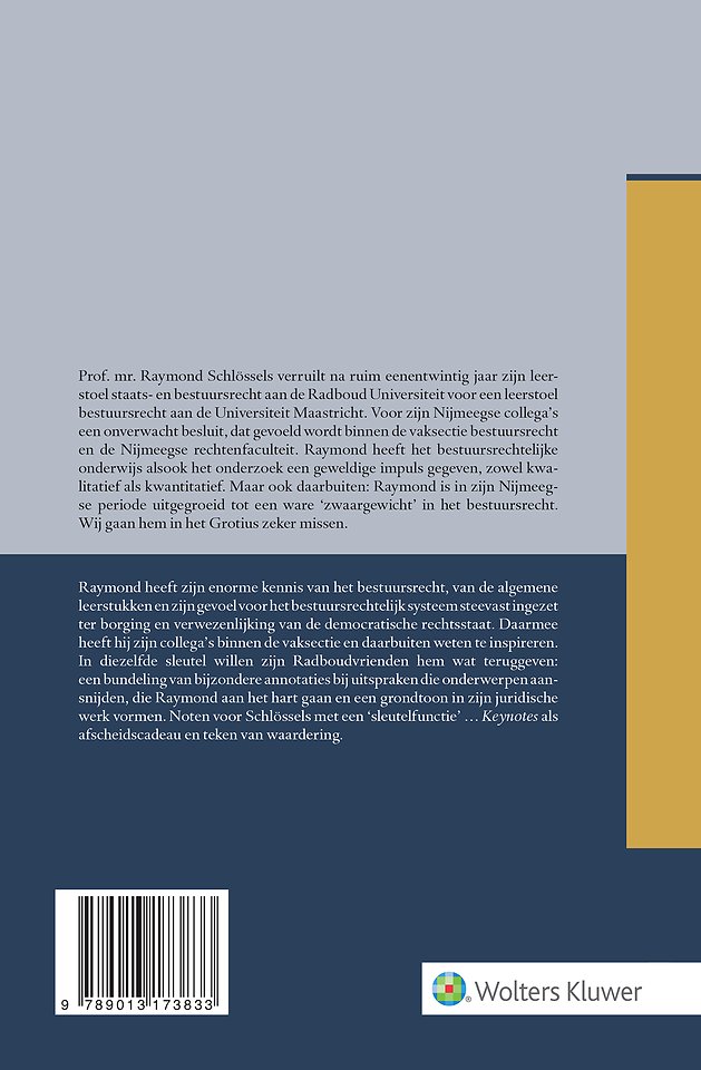 Prof. mr. Raymond Schlössels verruilt na ruim eenentwintig jaar zijn leerstoel staats- en bestuursrecht aan de Radboud Universiteit voor een leerstoel bestuursrecht aan de Universiteit Maastricht. Keynotes Nijmeegse annotaties als afscheid van Raymond Schlössels vormt een passende afscheidsbundel. De bundel weerspiegelt Raymonds enorme kennis van het bestuursrecht, van de algemene leerstukken en zijn gevoel voor het bestuursrechtelijk systeem. De bundel is opgedeeld in drie delen: