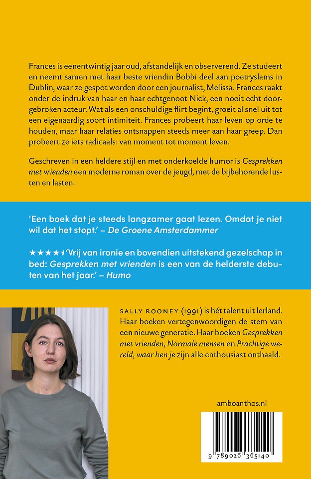 Gesprekken met vrienden van Sally Rooney is een moderne roman over de lusten en lasten van de jeugd. Rooney schrijft in een heldere stijl en met onderkoelde humor. Gesprekken met vrienden is Rooneys debuutroman, die door The Guardian als een van de belangrijkste debuten van 2017 is uitgeroepen.