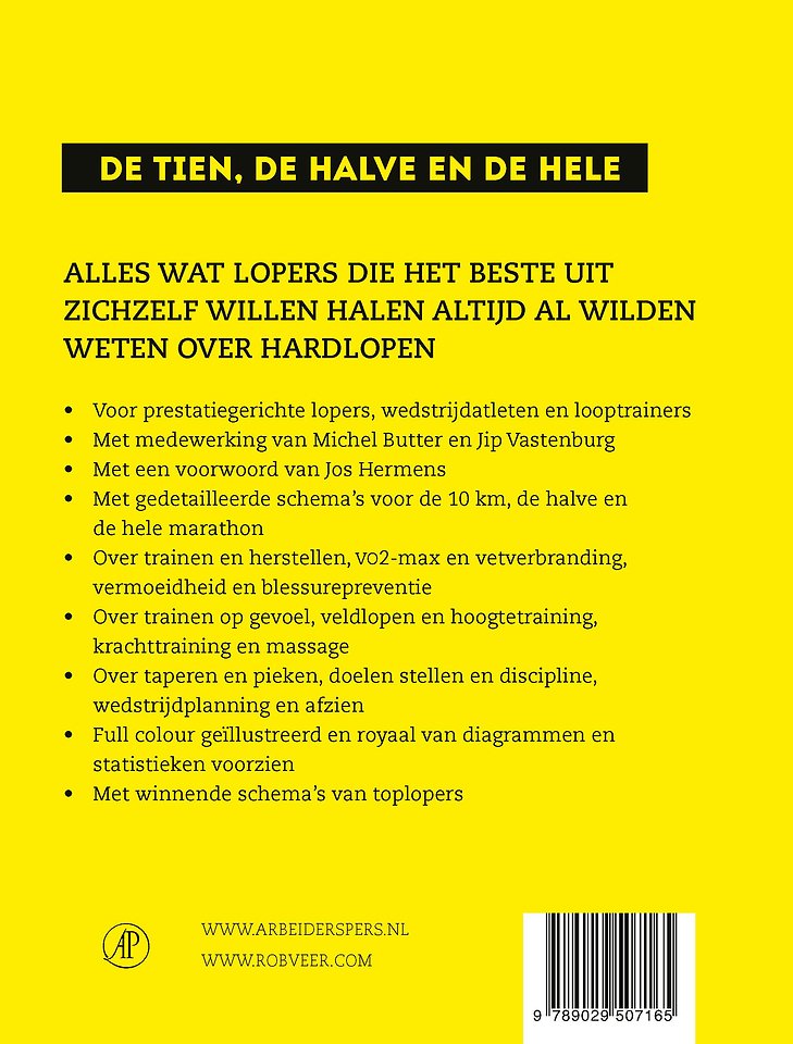 De tien, de halve en de hele is de weerslag van de jarenlange ervaring van hardlooptrainer Rob Veer in de begeleiding van zowel lopers op topniveau als prestatiegerichte amateurs. Trainingsmethodes, hartslagmeter, rust, voeding, adem, techniek: alle onderdelen van het lopen, vertaald naar de laatste wetenschappelijke ontwikkelingen, komen, rijkelijk voorzien van praktische adviezen en tips, aan bod in dit complete handboek waarin de focus ligt op de populaire lange afstanden. Loop sneller, voorkom blessures en haal meer voldoening uit het lopen.