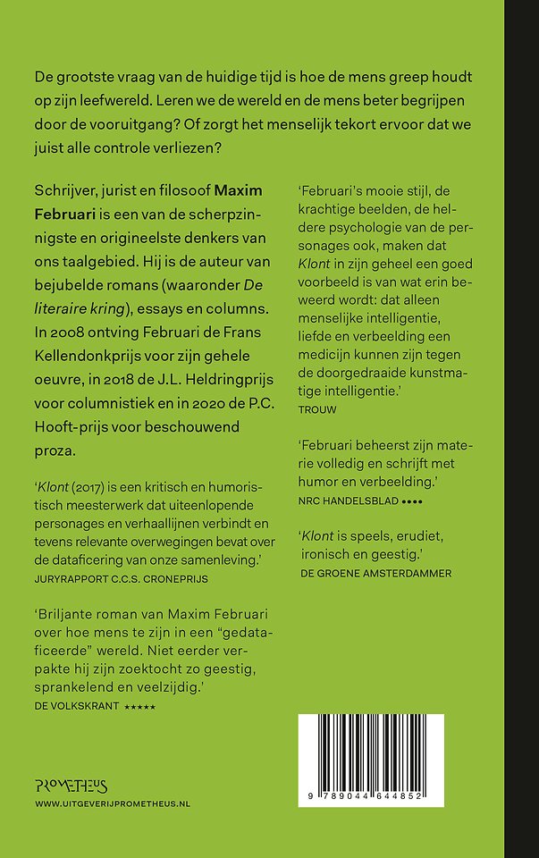 ‘Klont (2017) is een kritisch en humoristisch meesterwerk dat uiteenlopende personages en verhaallijnen verbindt en tevens relevante overwegingen bevat over de dataficering van onze samenleving.’ - JURYRAPPORT C.C.S. CRONEPRIJS
