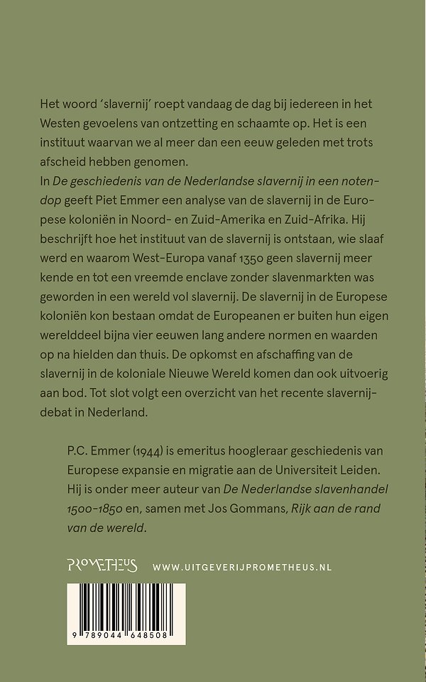 In 'De geschiedenis van de Nederlandse slavernij' in een notendop geeft Piet Emmer een analyse van de slavernij in de Europese koloniën in Noord- en Zuid-Amerika en Zuid-Afrika. Hij beschrijft hoe het instituut van de slavernij is ontstaan, wie slaaf werd en waarom West-Europa vanaf 1350 geen slavernij meer kende en tot een vreemde enclave zonder slavenmarkten was geworden in een wereld vol slavernij.