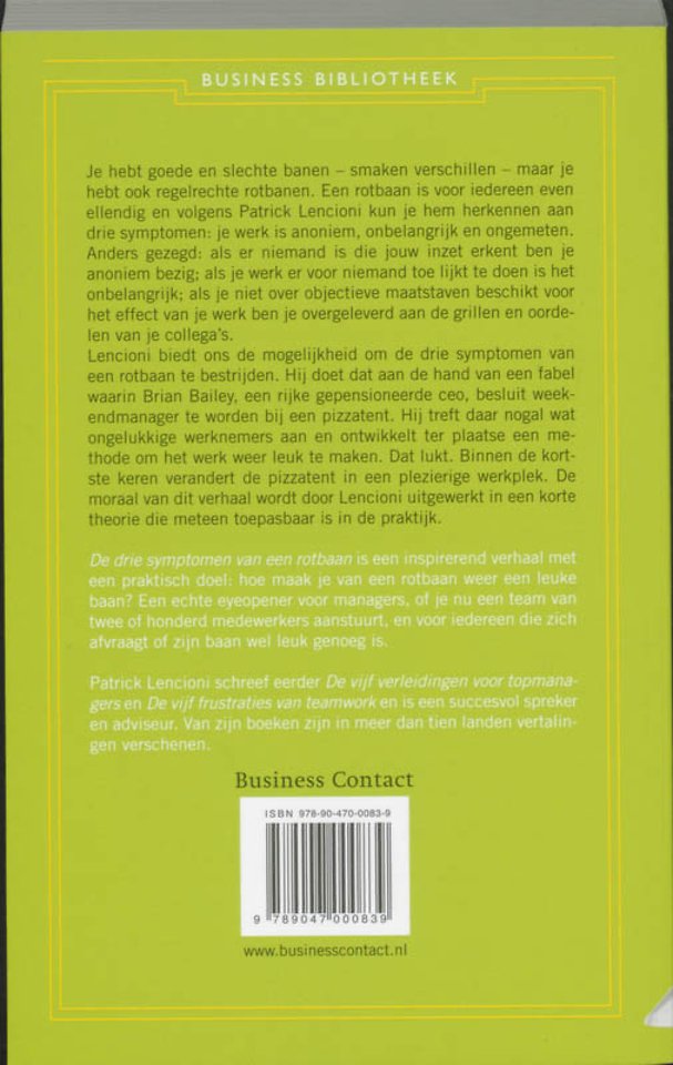 In 'De drie symptomen van een rotbaan' neemt Patrick Lencioni plezier in het werk onder de loep. Wat voor de één een goede baan is, is voor een ander een slechte carrièrestap. Een rotbaan daarentegen, is voor iedereen even erg.