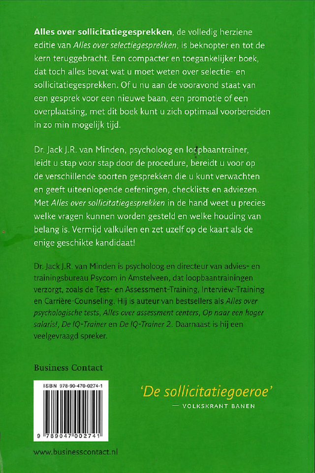 Of u nu aan de vooravond staat van een gesprek voor een nieuwe baan, een promotie of een overplaatsing, met dit boek kunt u zich optimaal voorbereiden in zo min mogelijk tijd. Dr. Jack J.R. van Minden, psycholoog en loopbaantrainer, leidt u stap voor stap door de procedure, bereidt u voor op de verschillende soorten gesprekken die u kunt verwachten en geeft uiteenlopende oefeningen, checklists en adviezen. Met 'Alles over sollicitatiegesprekken' in de hand weet u precies welke vragen kunnen worden gesteld en welke houding van belang is. U kunt valkuilen vermijden en uzelf op de kaart zetten als de enige geschikte kandidaat!