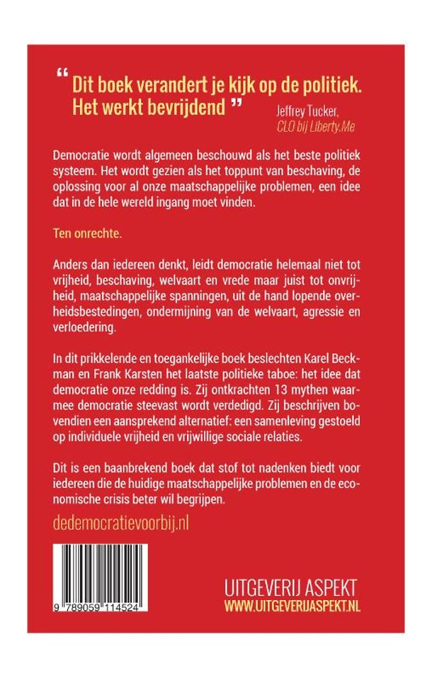 In dit prikkelende en toegankelijke boek beslechten Karel Beckman en Frank Karsten het laatste politieke taboe: het idee dat democratie onze redding is. Zij ontkrachten 13 mythen en leugens waarmee democratie steevast wordt verdedigd. Zij beschrijven bovendien een aansprekend alternatief: een samenleving gestoeld op individuele vrijheid en vrijwillige sociale relaties.