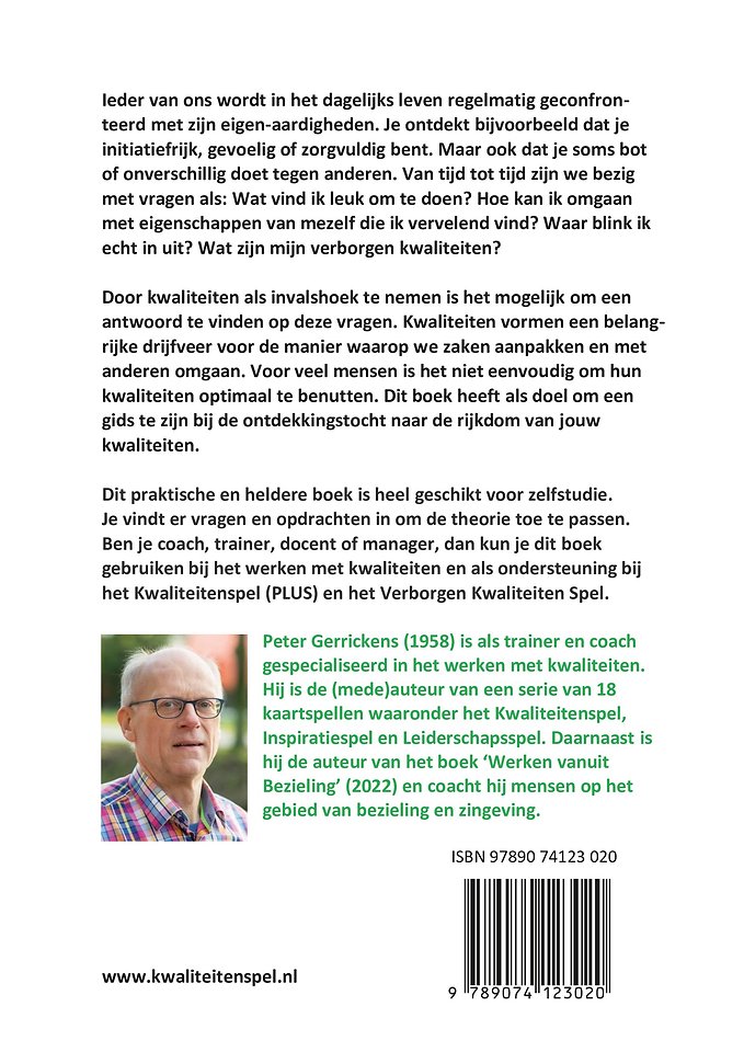 Dit praktische en heldere boek is bedoeld om je te helpen om je eigen kwaliteiten optimaal te benutten. Je vindt er ook vragen en opdrachten in om de theorie toe te passen. Ben je coach, trainer, docent of manager, dan vind je in dit boek de nieuwste inzichten en methodieken in het werken met kwaliteiten. Je kunt het ook gebruiken als ondersteuning bij het Kwaliteitenspel (PLUS) en het Verborgen Kwaliteiten Spel.