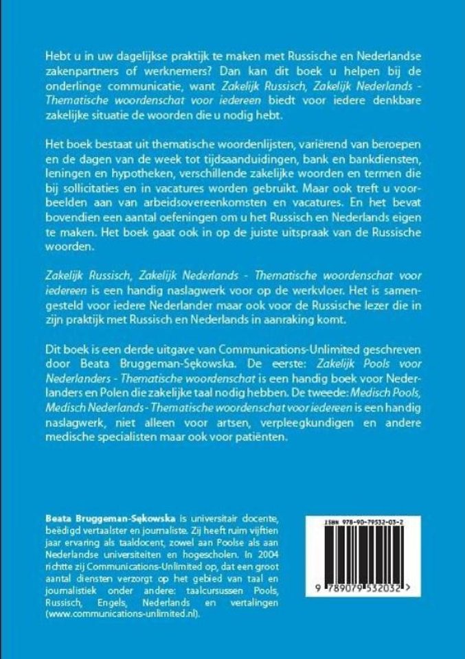 'Zakelijk Russisch, Zakelijk Nederlands' is een boek voor iedereen die zakelijk Russisch en Nederlands nodig heeft. Dit boek van 221 pagina's is een handig naslagwerk voor op de werkvloer en kan gebruikt worden voor zelfstudie, maar ook in elke cursus waarin de zakelijke woordenschat aan de orde komt.