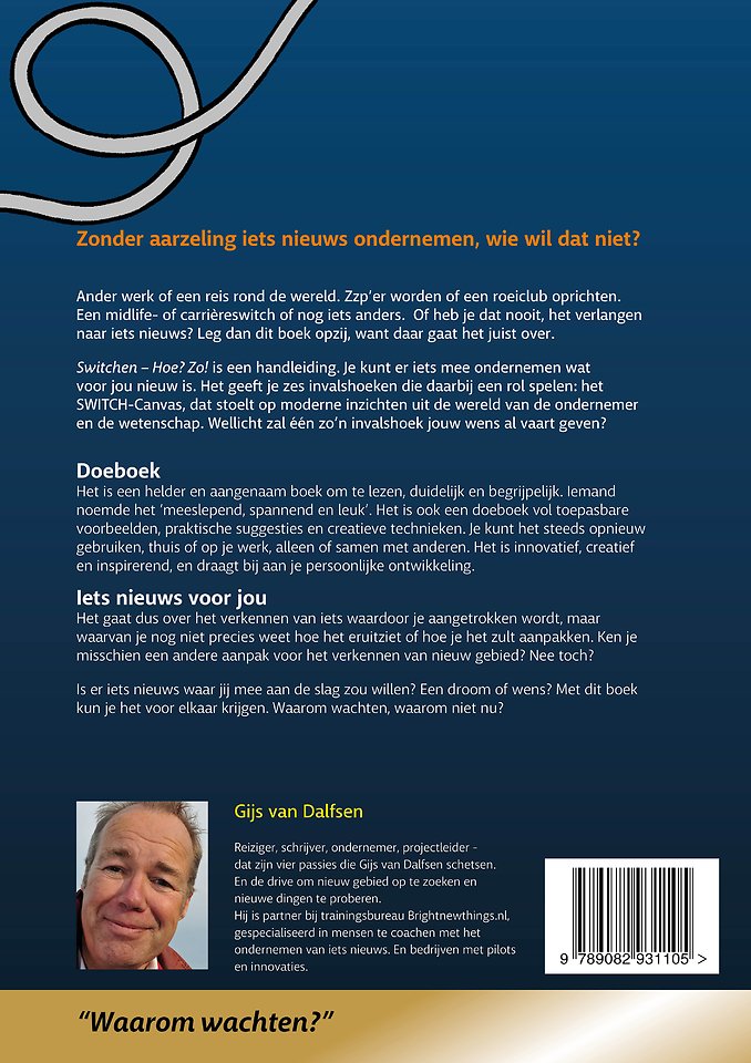 Switchen – Hoe? Zo! is een handleiding. Je kunt er iets mee ondernemen wat voor jou nieuw is. Het geeft je zes invalshoeken die daarbij een rol spelen: het SWITCH-Canvas, dat stoelt op moderne inzichten uit de wereld van de ondernemer en de wetenschap. Wellicht zal één zo’n invalshoek jouw wens al vaart geven?