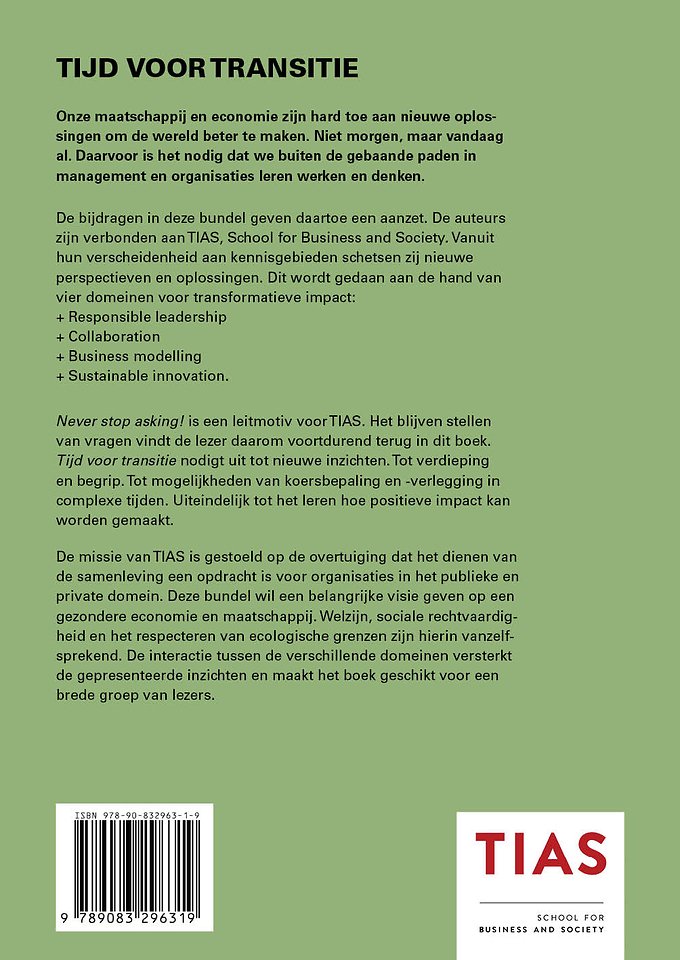 Never stop asking! is een leitmotiv voor TIAS. Het blijven stellen van vragen vindt de lezer daarom voortdurend terug in dit boek. Tijd voor transitie nodigt uit tot nieuwe inzichten. Tot verdieping en begrip. Tot mogelijkheden van koersbepaling en -verlegging in complexe tijden. Uiteindelijk tot het leren hoe positieve impact kan worden gemaakt.