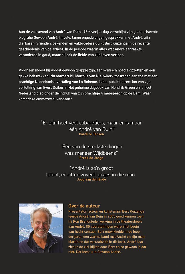 Aan de vooravond van André van Duins 75ste verjaardag verschijnt zijn geautoriseerde biografie Gewoon André. In vele, lange ongedwongen gesprekken met André, zijn dierbaren, vrienden, bekenden en vakbroeders duikt Bert Kuizenga in de recente geschiedenis van de artiest. In de periode waarin alles wat André aanraakte, veranderde in goud, maar hij ook de liefde van zijn leven verloor.