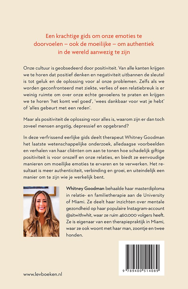 In deze verfrissend eerlijke gids deelt therapeut Whitney Goodman het laatste wetenschappelijke onderzoek, alledaagse voorbeelden en verhalen van haar cliënten om aan te tonen hoe schadelijk giftige positiviteit is voor onszelf en onze relaties, en biedt ze eenvoudige manieren om moeilijke emoties te ervaren en te verwerken. Het resultaat is meer authenticiteit, verbinding en groei, en uiteindelijk een manier om te zijn wie je werkelijk bent.