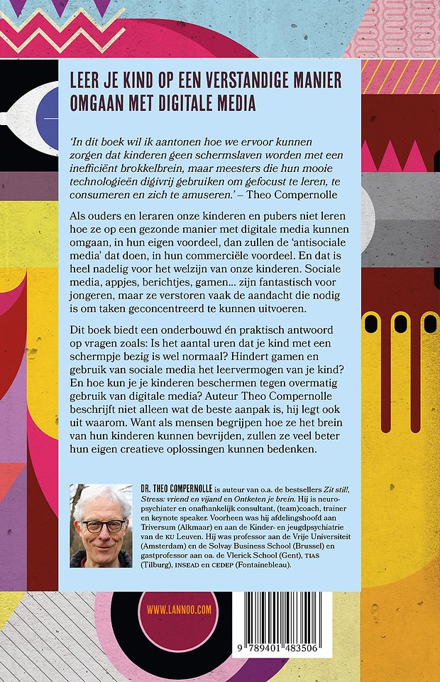 Dit boek biedt een onderbouwd én praktisch antwoord op vragen zoals: Is het aantal uren dat je kind met een schermpje bezig is wel normaal? Hindert gamen en gebruik van sociale media het leervermogen van je kind? En hoe kun je je kinderen beschermen tegen overmatig gebruik van digitale media? Auteur Theo Compernolle beschrijft niet alleen wat de beste aanpak is, hij legt ook uit waarom. Want als mensen begrijpen hoe ze het brein van hun kinderen kunnen bevrijden, zullen ze veel beter hun eigen creatieve oplossingen kunnen bedenken.