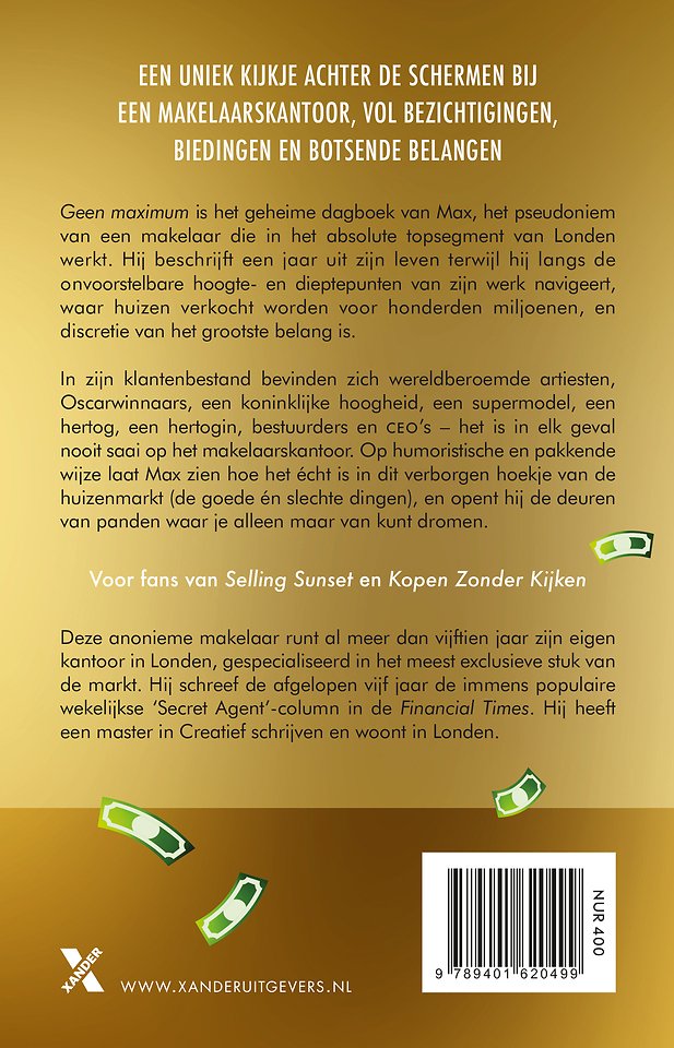 Op humoristische en pakkende wijze laat hij in 'Geen maximum' zien hoe het écht is in dit verborgen hoekje van de huizenmarkt, en opent hij de deuren van panden waar wij alleen maar van kunnen dromen. Voor fans van Selling Sunset, Kopen Zonder Kijken en Dit doet even pijn.