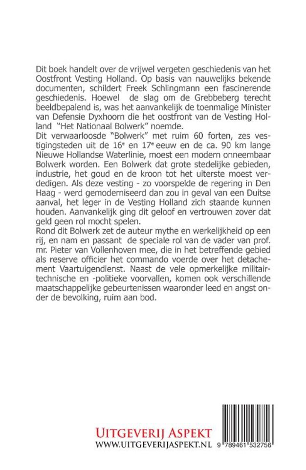 Dit boek handelt over de vrijwel vergeten geschiedenis van het Oostfront Vesting Holland. Op basis van nauwelijks bekende documenten, schildert Freek Schlingmann een fascinerende geschiedenis. Hoewel de slag om de Grebbeberg terecht beeldbepalend is, was het aanvankelijk de toenmalige Minister van Defensie Dyxhoorn die het oostfront van de Vesting Holland "Het Nationaal Bolwerk" noemde.