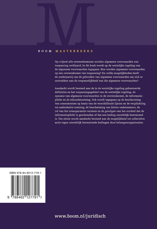 Op vrijwel alle overeenkomsten worden algemene voorwaarden van toepassing verklaard. In dit boek wordt op de wettelijke regeling van de algemene voorwaarden (stand 1-9-2023) ingegaan. Hoe worden algemene voorwaarden op een overeenkomst van toepassing? En welke mogelijkheden heeft de wederpartij van de gebruiker van algemene voorwaarden om zich te onttrekken aan de toepasselijkheid van die algemene voorwaarden
