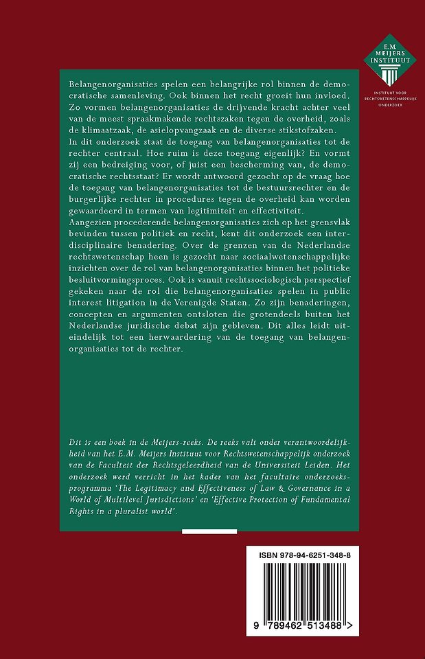 In dit onderzoek staat de toegang van belangenorganisaties tot de rechter centraal. Hoe ruim is deze toegang eigenlijk? En vormt zij een bedreiging voor, of juist een bescherming van, de democratische rechtsstaat? Er wordt antwoord gezocht op de vraag hoe de toegang van belangenorganisaties tot de bestuursrechter en de burgerlijke rechter in procedures tegen de overheid kan worden gewaardeerd in termen van legitimiteit en effectiviteit.