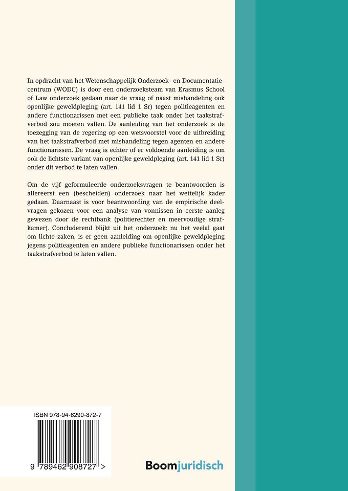In opdracht van het Wetenschappelijk Onderzoek- en Documentatiecentrum (WODC) is door een onderzoeksteam van Erasmus School of Law onderzoek gedaan naar de vraag of naast mishandeling ook openlijke geweldpleging (art. 141 lid 1 Sr) tegen politieagenten en andere functionarissen met een publieke taak onder het taakstrafverbod zou moeten vallen. De aanleiding van het onderzoek is de toezegging van de regering op een wetsvoorstel voor de uitbreiding van het taakstrafverbod met mishandeling tegen agenten en andere functionarissen. De vraag is echter of er voldoende aanleiding is om ook de lichtste variant van openlijke geweldpleging (art. 141 lid 1 Sr) onder dit verbod te laten vallen.