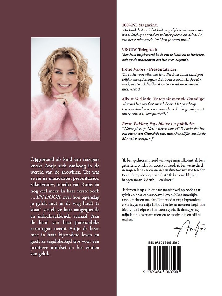 Opgegroeid als kind van reizigers knokt Antje zich omhoog in de wereld van de showbizz. Tot wat ze nu is: musicalster, presentatrice, zakenvrouw, moeder van Romy en nog veel meer. In haar eerste boek '... EN DOOR, over hoe tegenslag je geluk niet in de weg hoeft te staan' vertelt ze haar aangrijpende en indrukwekkende verhaal. Aan de hand van haar persoonlijke ervaringen neemt Antje de lezer mee in haar bijzondere leven en geeft ze tegelijkertijd tips voor een positieve mindset en het vinden van geluk.