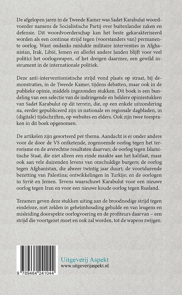 Deze anti-interventionistische strijd vond plaats op straat, bij demonstraties, in de Tweede Kamer, tijdens debatten, maar ook in de publieke opinie, middels ingezonden stukken. Dit boek is een bundeling van een selectie van de indringende en heldere opiniestukken van Sadet Karabulut op dit terrein, die, op een enkele uitzondering na, eerder gepubliceerd zijn in nationale en regionale dagbladen, in (digitale) tijdschriften, op websites en elders. Ook zijn twee toespraken in dit boek opgenomen.