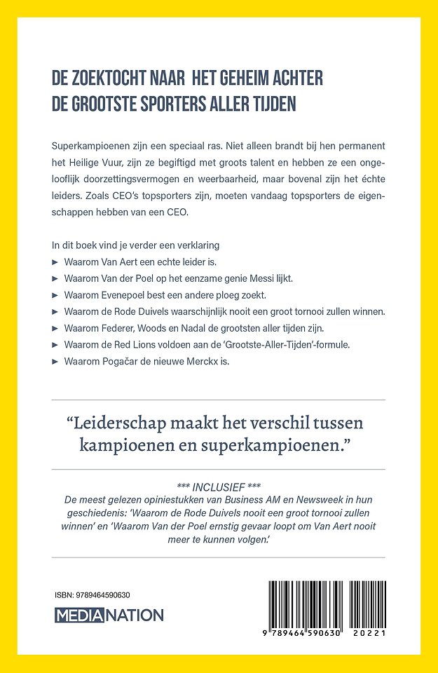 Superkampioenen zijn een speciaal ras. Niet alleen brandt bij hen permanent het heilige vuur, zijn ze begiftigd met groots talent en hebben ze een ongelooflijk doorzettingsvermogen en weerbaarheid maar bovenal zijn het échte leiders. De kenmerken die ze nodig hebben lijken nog het meest op deze van een sterke CEO. Zoals CEO’s topsporters zijn, moeten vandaag topsporters de eigenschappen hebben van een CEO.