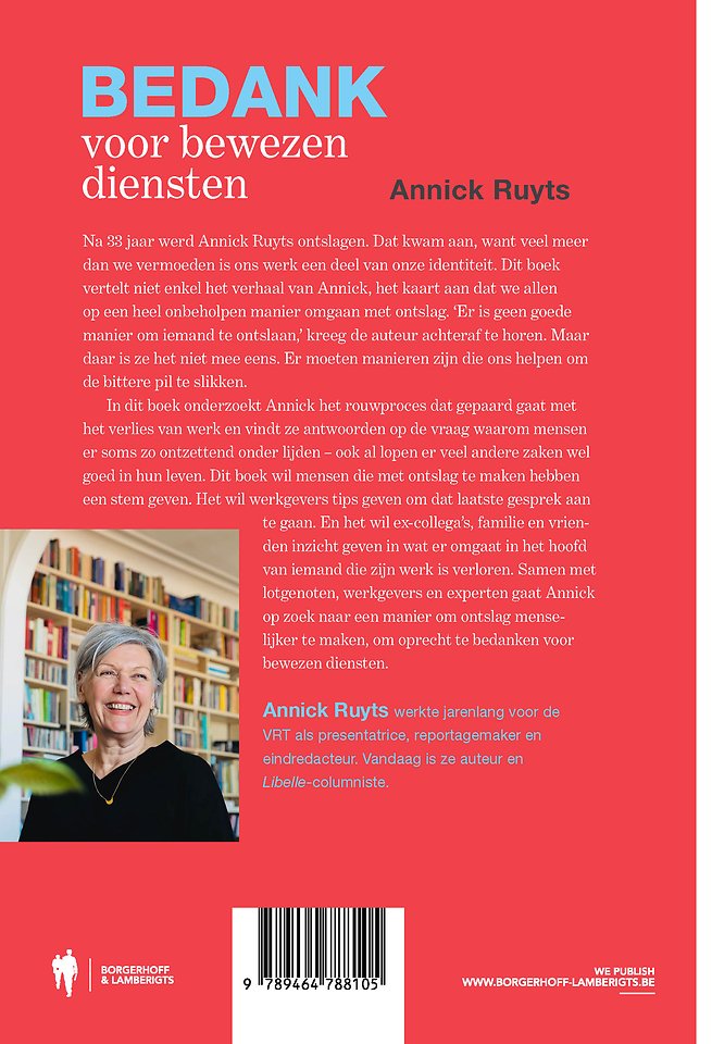 Na 33 jaar werd Annick Ruyts ontslagen. Dat kwam aan, want veel meer dan we vermoeden is ons werk een deel van onze identiteit. Dit boek vertelt niet enkel het verhaal van Annick, het kaart aan dat we allen op een heel onbeholpen manier omgaan met ontslag. ‘Er is geen goede manier om iemand te ontslaan,’ kreeg de auteur achteraf te horen. Maar daar is ze het niet mee eens. Er moeten manieren zijn die ons helpen om de bittere pil te slikken.