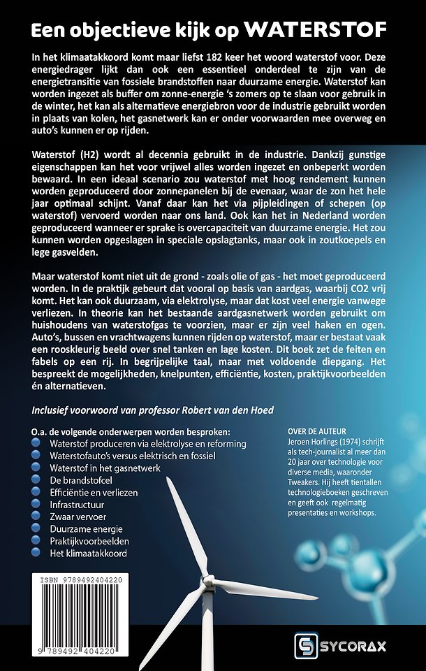 Auto’s, bussen en vrachtwagens kunnen rijden op waterstof, maar er bestaat vaak een rooskleurig beeld over snel tanken en lage kosten. Dit boek bespreekt alles over waterstof - de mogelijkheden, knelpunten, elektrolyse en efficiëntie, kosten, praktijkvoorbeelden, mogelijkheden voor bedrijven en thuis én alternatieven.