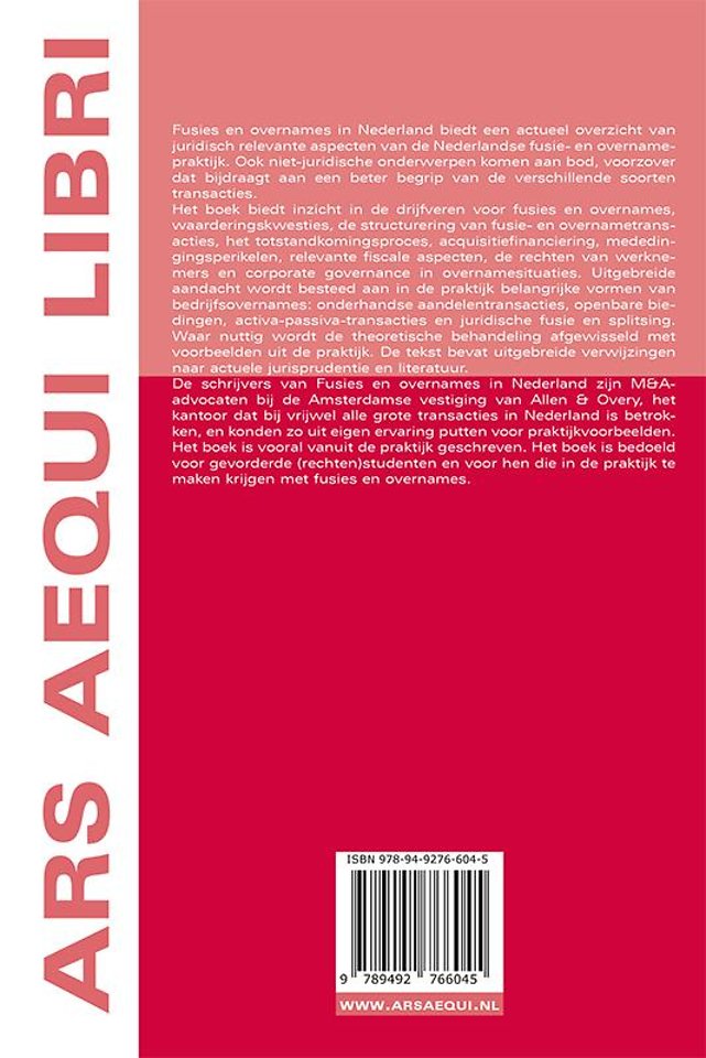 Fusies en overnames in Nederland biedt een actueel overzicht van juridisch relevante aspecten van de Nederlandse fusie- en overnamepraktijk. Ook niet-juridische onderwerpen komen aan bod, voorzover dat bijdraagt aan een beter begrip van de verschillende soorten transacties.