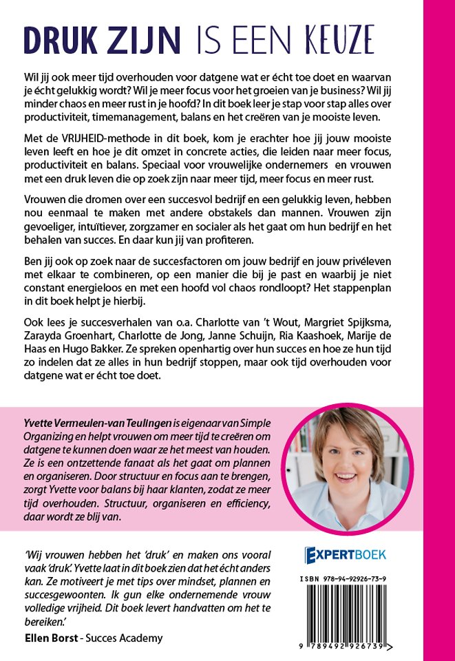 'Wij vrouwen hebben het 'druk' en maken ons vooral vaak'druk'.Yvette laat in dit boek zien dat het écht anders kan. Ze motiveert je met tips over mindset, plannen en succesgewoonten. Ik gun elke ondernemende vrouw volledige vrijheid Dit boek llevert handvatten om het te