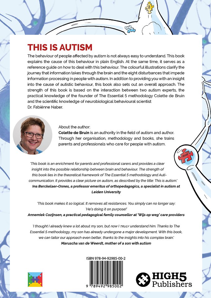 The strength of this book is based on the interaction between two autism experts, the practical knowledge of the founder of The Essential 5 methodology Colette de Bruin and the scientific knowledge of neurobiological behavioural scientist Dr. Fabiënne Naber.