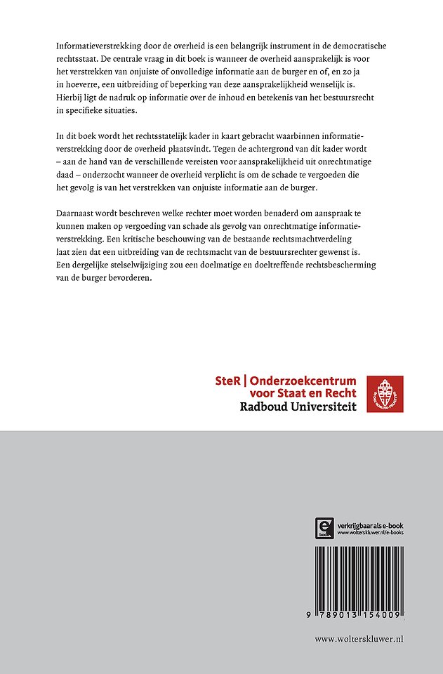 Wanneer is de overheid aansprakelijk voor het verstrekken van onjuiste of onvolledige informatie aan de burger? En in hoeverre is een uitbreiding of beperking van deze aansprakelijkheid wenselijk? Deze bundel biedt een actueel, uitputtend overzicht en een analyse van de rechtspraak omtrent aansprakelijkheid van de overheid voor onjuiste informatieverstrekking.