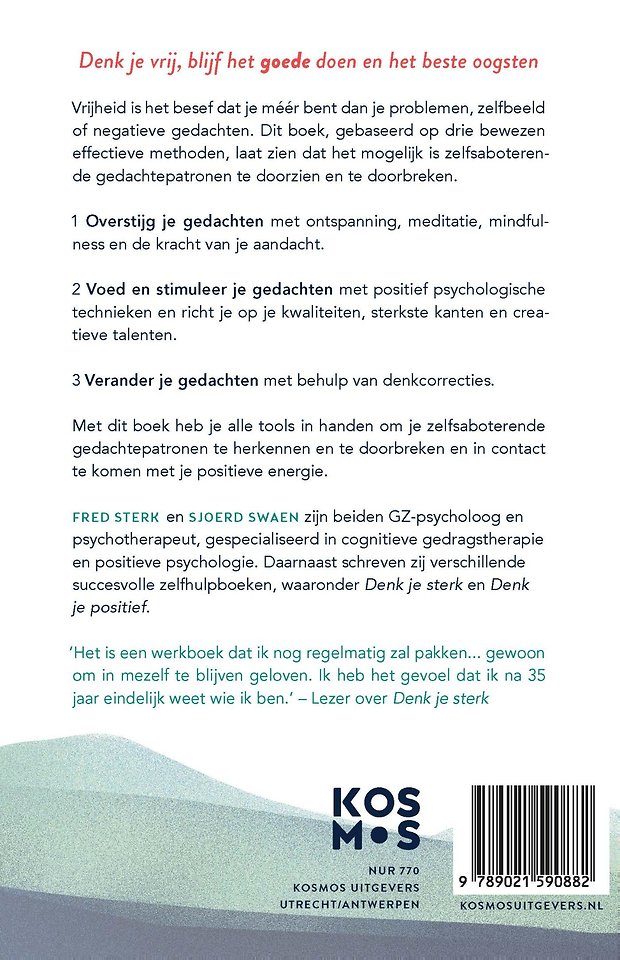 FRED STERK en SJOERD SWAEN zijn beiden GZ-psycholoog en psychotherapeut, gespecialiseerd in cognitieve gedragstherapie en positieve psychologie. Daarnaast schreven zij verschillende succesvolle zelfhulpboeken, waaronder Denk je sterk en Denk je positief.