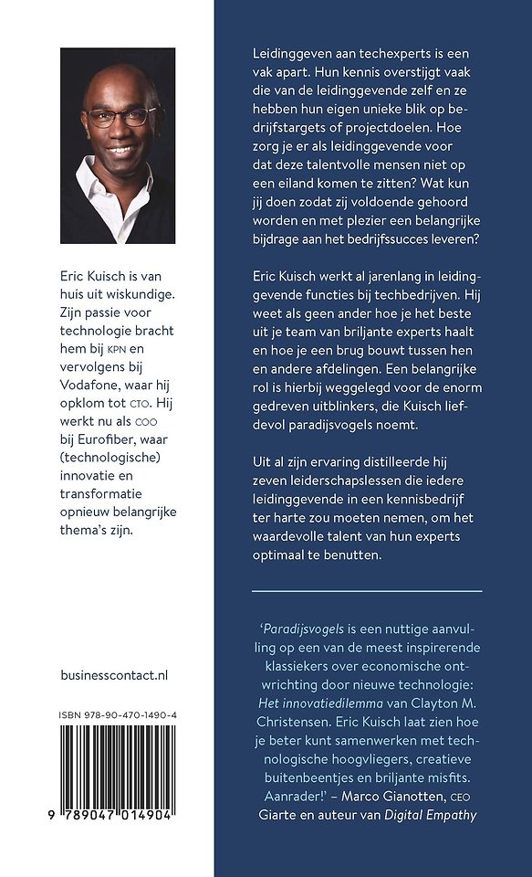 Meer over Eric KuischIn 'Paradijsvogels' legt Eric Kuisch uit waarom leidinggeven aan techexperts een vak apart is. Hun kennis overstijgt vaak die van de leidinggevende zelf en ze hebben hun eigen unieke blik op bedrijfstargets of projectdoelen. Hoe zorg je er als leidinggevende voor dat deze talentvolle mensen niet op een eiland komen te zitten? Wat kun jij doen zodat zij voldoende gehoord worden en met plezier een belangrijke bijdrage aan het bedrijfssucces leveren?