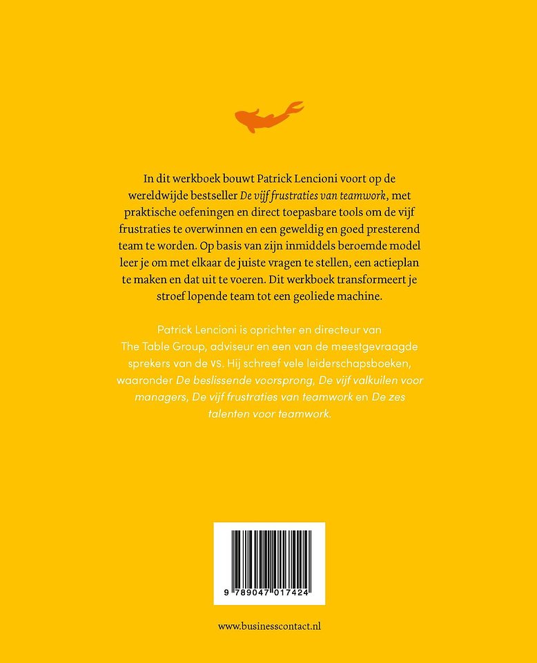 Meer over Patrick LencioniSamenwerken is het mooiste maar ook het lastigste dat er is. In de wereldwijde bestseller 'De vijf frustraties van teamwork' legde Patrick Lencioni met een heldere parabel de grootste valkuilen van samenwerken bloot: gebrek aan vertrouwen, angst voor confrontatie, gebrek aan betrokkenheid, afschuiven van verantwoordelijkheid en niet-resultaatgericht werken. Het boek veranderde hoe miljoenen mensen denken over samenwerken en gaf ze de sleutel in handen om het beter te doen.