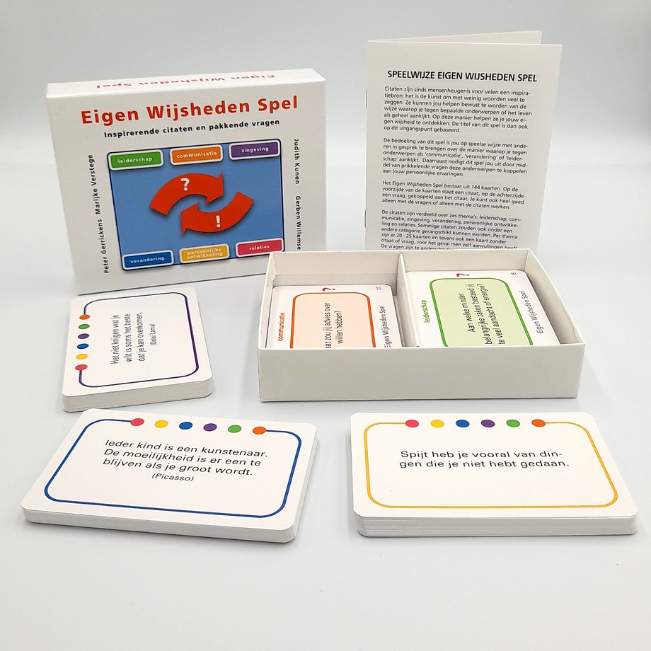 Het 'Eigen Wijsheden Spel' bestaat uit 144 kaarten. Op de voorzijde van de kaarten staat een citaat, op de achterzijde een vraag, gekoppeld aan het citaat. U kunt ook heel goed alleen met de vragen of alleen met de citaten werken.